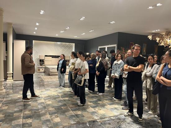 Gezi kapsamında ilk olarak Dafne’s Mobilya ziyaret edildi. Firma yetkilileri tarafından mağaza alanında ürünler tanıtılırken, üretim tesisinde kullanılan malzemeler, üretim teknolojileri, makine parkuru, üretim süreci ve paketleme yöntemleri hakkında öğrencilere ayrıntılı bilgiler verildi. Böylece öğrenciler, mobilya tasarımının satışa hazır bir ürüne dönüşüm sürecini aşamalarıyla yerinde gözlemleme fırsatı buldu.