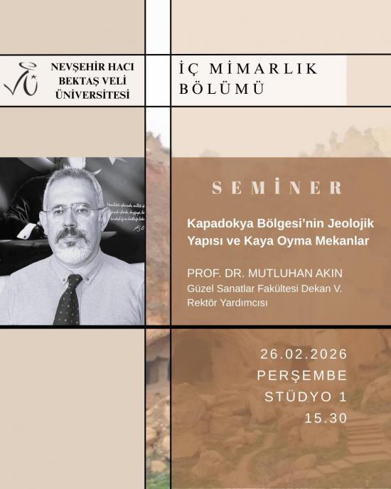 Kapadokya Bölgesi'nin jeolojik yapısı ve kaya oyma mekânlarını ele alacağımız, Dekanımız Prof. Dr. Mutluhan Akın ile bir araya geleceğimiz seminerimize tüm öğrencilerimizi davet ediyoruz.