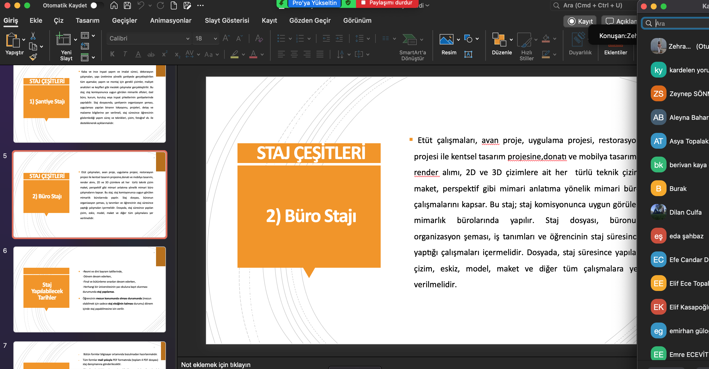 Toplantıda, büro stajı ve şantiye stajı süreçlerine ilişkin kapsamlı bilgilendirme yapılmıştır. Stajların kapsamı, süresi, değerlendirme ölçütleri ve dikkat edilmesi gereken hususlar ayrıntılı şekilde ele alınmıştır.