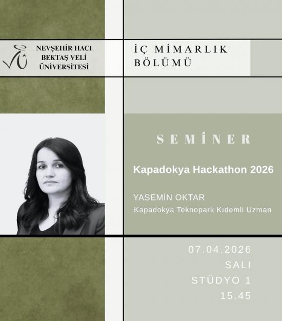 Kapadokya Teknopark Kıdemli Uzmanı Yasemin Oktar, “Kapadokya Hackathon 2026” başlıklı semineri ile Nevşehir Hacı Bektaş Veli Üniversitesi İç Mimarlık Bölümü öğrencileriyle buluşuyor. Seminerde Kapadokya Hackathon 2026 süreci, başvuru aşamaları ve etkinliğe dair genel bilgilendirme paylaşılacaktır.