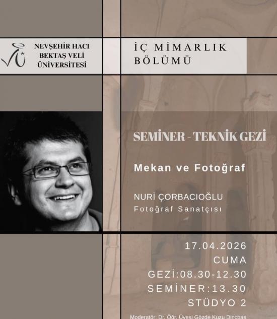 Nevşehir Hacı Bektaş Veli Üniversitesi İç Mimarlık Bölümü, Seminer – Teknik Gezi kapsamında Fotoğraf Sanatçısı Nuri Çorbacıoğlu ile “Mekan ve Fotoğraf” başlıklı etkinlikte buluşuyor. 17 Nisan Cuma günü gerçekleştirilecek etkinlikte, mekan ve fotoğraf ilişkisi üzerine kapsamlı paylaşımlar yapılacaktır.